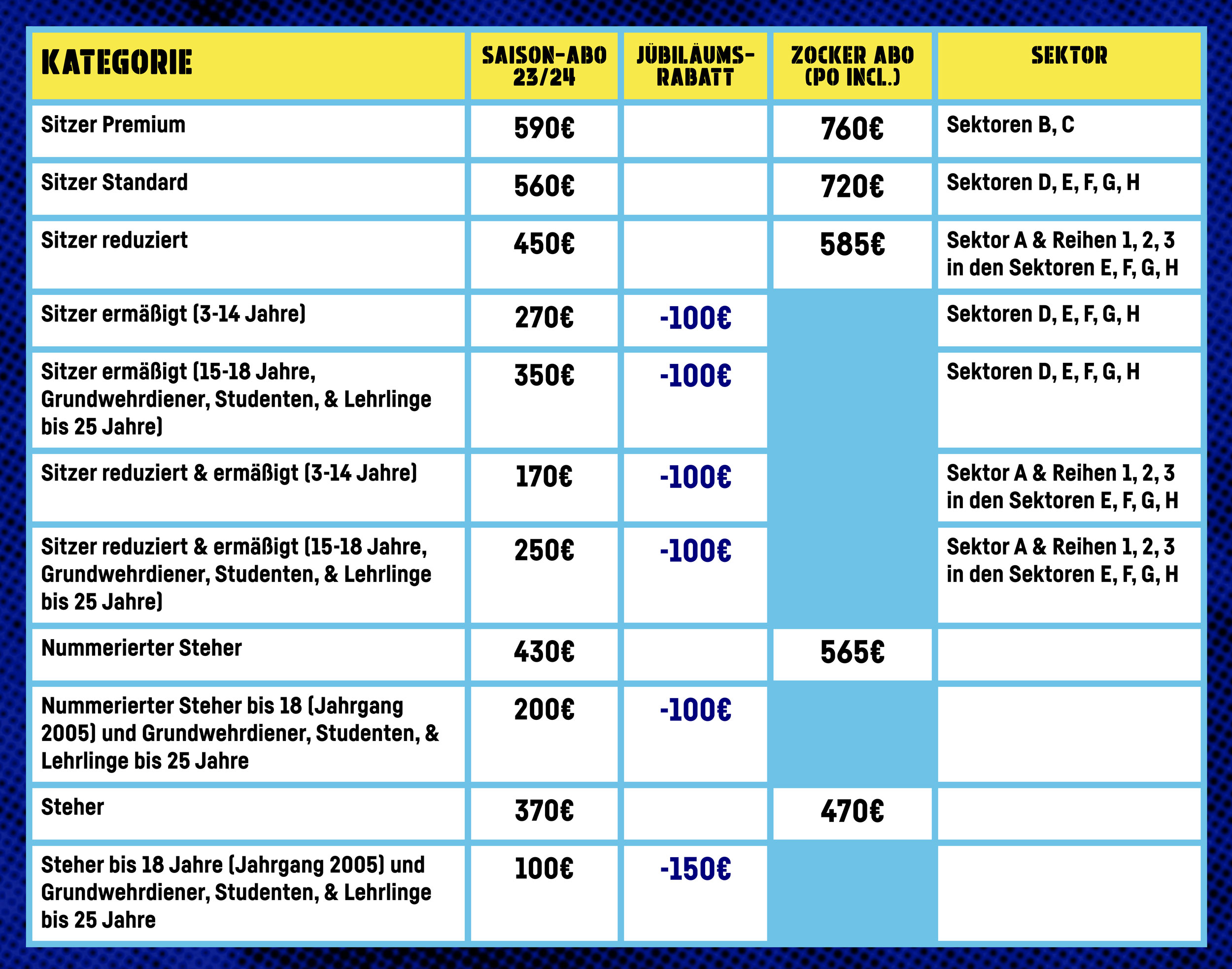 Für unsere jungen Fans haben wir zu unserem 100-Jahr-Jubiläum ein ganz besonderes Jubiläumspaket geschnürt: Für Kinder und Jugendliche aber auch in Ausbildung befindliche Personen bis 25 Jahre gibt es das Steher-Abo 2023/24 um 100 Euro. Damit bedeutet gleichzeitig, dass man bei 28 Heimspielen auf Kosten von rund 3,50 Euro pro Match. Das bedeutet eine Reduzierung der Preise für unsere Jugend um bis zu 150 Euro! In Zeiten, in denen die Preise überall massiv steigen, ist das ein ganz starkes Zeichen für die Jugend. Richtig Cool! Der Abo-Verkauf startet am 15. Mai.